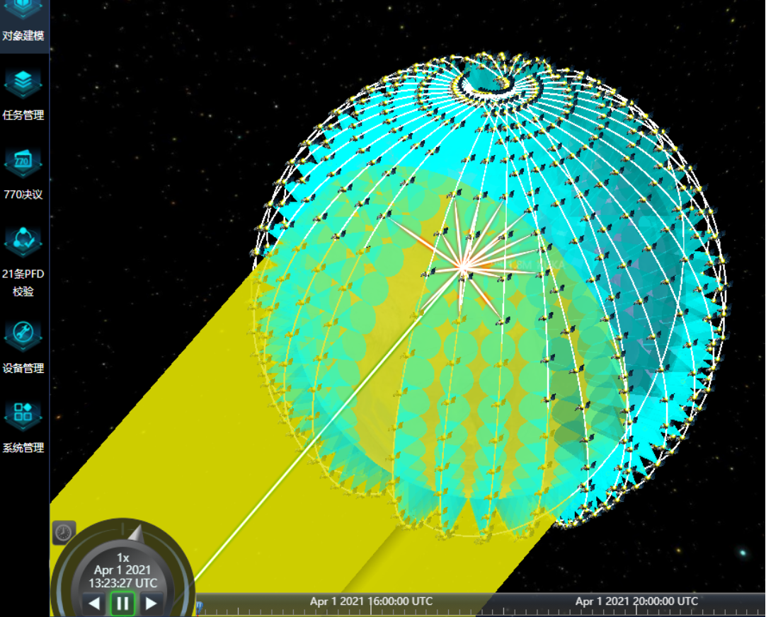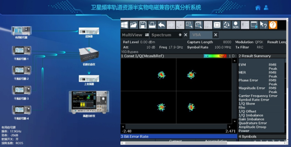 系统通过软件和仪器设备搭建半物理仿真环境,模拟GSO卫星系统、NGSO星座系统的信号在不同干扰场景下的收发及传输过程。根据仿真计算结果结合实测指标,给出相应的干扰规避策略,实现GSO卫星系统之间、NGSO星座和GSO卫星系统之间的频率协调和电磁兼容。