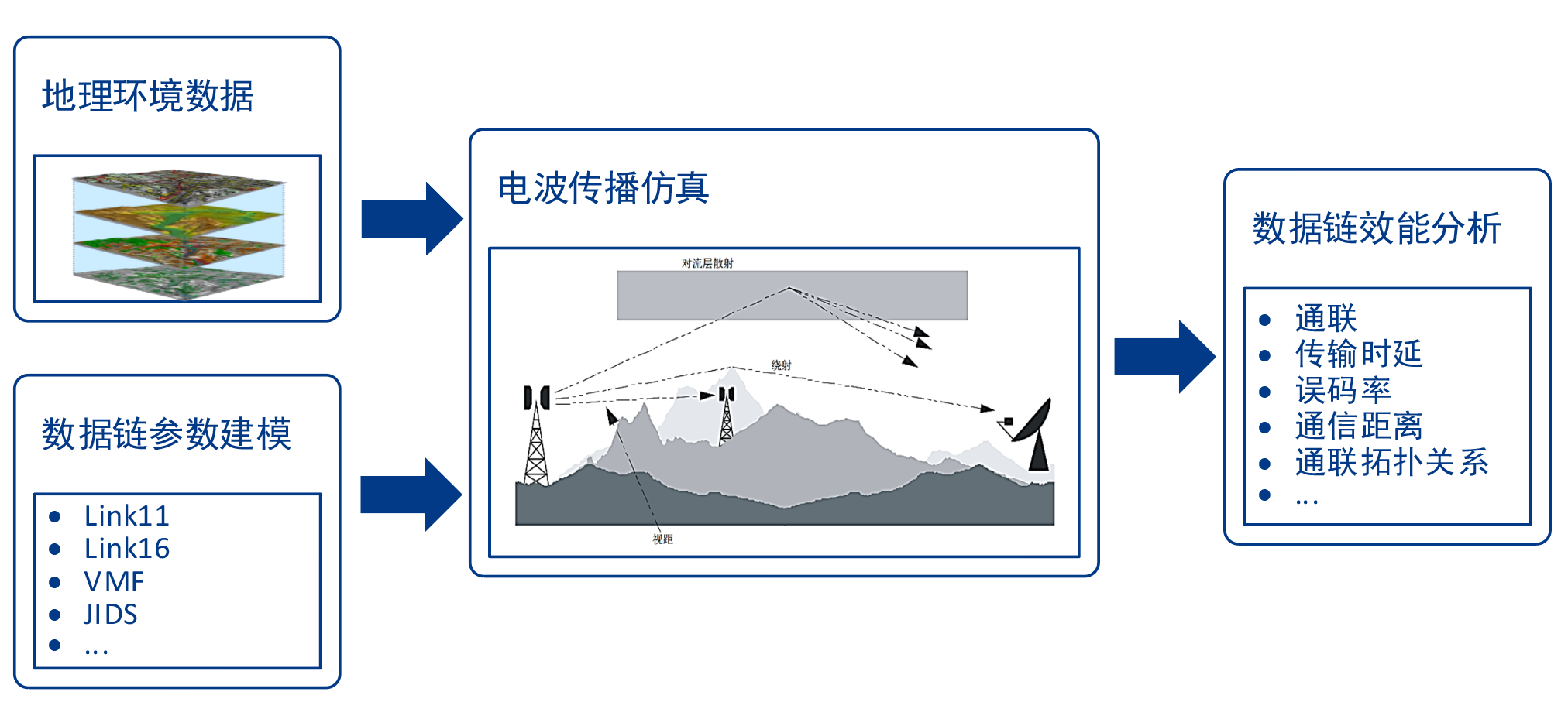 数据链效能仿真分析系统能够基于数据链参数化建模,结合地理环境信息,利用电波传播仿真方法分析数据链的通联、传输时延、误码率、丢包率、通信距离,能够给出直接和间接通联的通联拓扑关系。