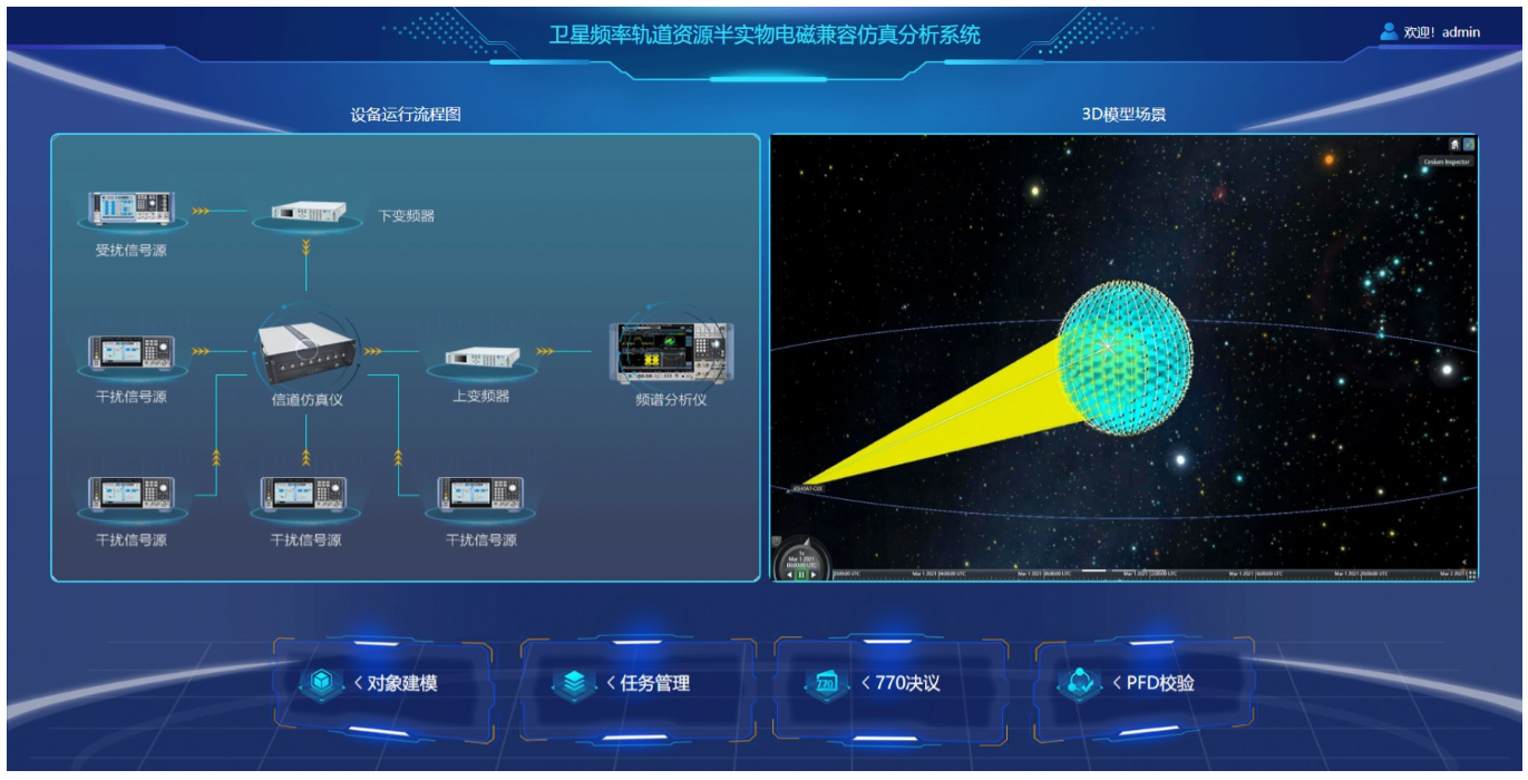 卫星频率轨道资源半实物电磁兼容仿真分析系统通过软件和仪器设备搭建半物理仿真环境,模拟静止轨道(GSO)卫星系统、非静止轨道(NGSO)星座系统的信号在相应干扰场景下的收发及传输过程,通过实测指标结合干扰规避策略等算法,实现对GSO卫星系统之间、NGSO星座系统与GSO卫星系统之间的频率兼容性分析。